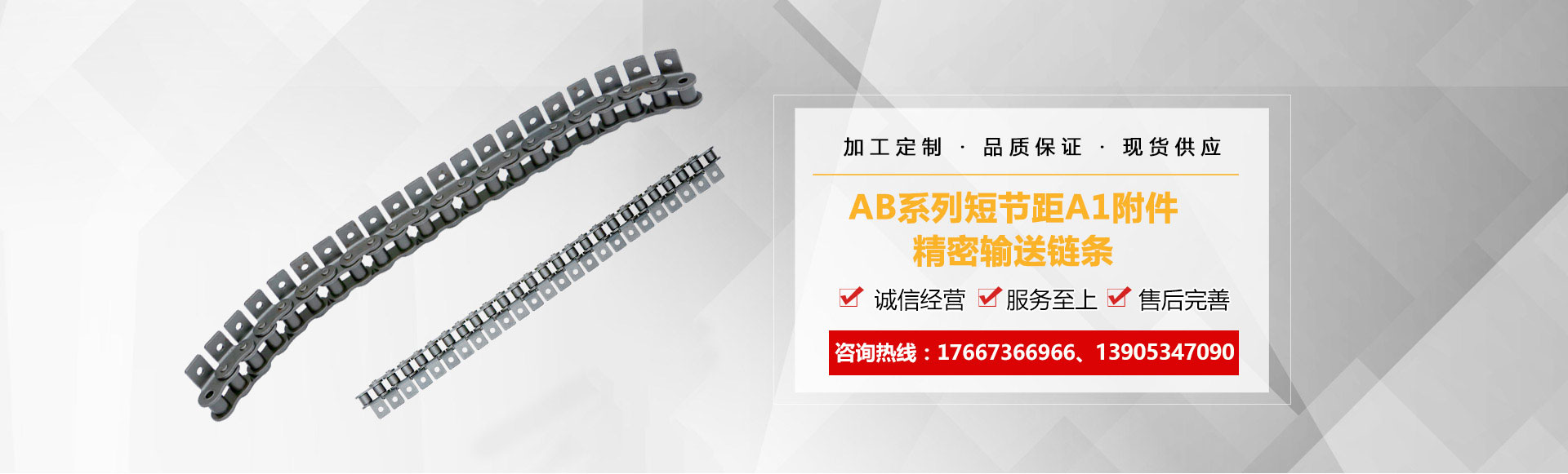1、链条产品有各种不锈钢、碳钢输送链条、双节距输送链条、空心销轴链条、不锈钢塑料平顶链、不锈钢精密滚子链、特殊工矿输送链、耐高温输送链条、非标链条、弯板非标链条、大节距输送链条、各种链条用滚子(材质碳钢、不锈钢)等。